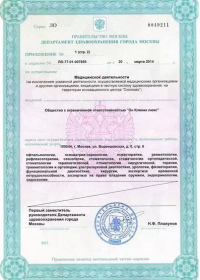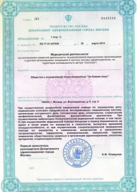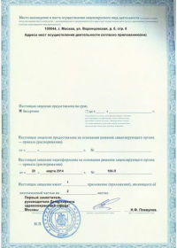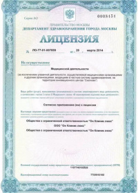 | Лицензии | 06.02.2020 Номер лицензии: ЛО-77-01-019563 Лицензируемый вид деятельности: Медицинская деятельность Дата внесения записи в реестр: 06.02.2020 Номер приказа о предоставлении лицензии: 87-Л Дата приказа о предоставлении лицензии: 06.02.2020 Адрес мест осуществления лицензируемого вида деятельности: 109147, г. Москва, ул. Воронцовская, д. 13/14, строен. 9 29.05.2019 Номер лицензии: ЛО-77-01-018142 Лицензируемый вид деятельности: Медицинская деятельность Дата внесения записи в реестр: 29.05.2019 Номер приказа о предоставлении лицензии: 400-Л Дата приказа о предоставлении лицензии: 29.05.2019 Адрес мест осуществления лицензируемого вида деятельности: 109044, г. Москва, ул. Воронцовская, д. 8, стр. 6 25.04.2019 Номер лицензии: ЛО-77-02-010234 Лицензируемый вид деятельности: Фармацевтическая деятельность Дата внесения записи в реестр: 25.04.2019 Номер приказа о предоставлении лицензии: 318-Л Дата приказа о предоставлении лицензии: 25.04.2019 Адрес мест осуществления лицензируемого вида деятельности: 109044, г. Москва, ул. Воронцовская, д. 8, стр. 6 |