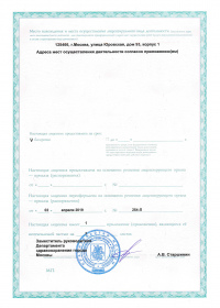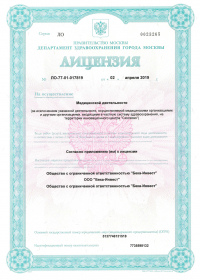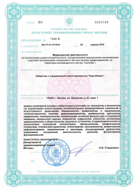 | Лицензии | 02.04.2019 Номер лицензии: ЛО-77-01-017819 Лицензируемый вид деятельности: Медицинская деятельность Дата внесения записи в реестр: 02.04.2019 Номер приказа о предоставлении лицензии: 254-Л Дата приказа о предоставлении лицензии: 02.04.2019 Адрес мест осуществления лицензируемого вида деятельности: 125466, г. Москва, ул. Юровская, д. 93, корп. 1 |