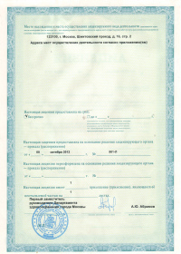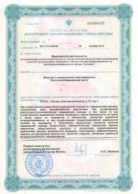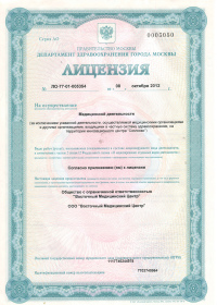 | Лицензии | 08.10.2012 Номер лицензии: ЛО-77-01-005354 Лицензируемый вид деятельности: Медицинская деятельность Дата внесения записи в реестр: 08.10.2012 Номер приказа о предоставлении лицензии: 561-Л Дата приказа о предоставлении лицензии: 08.10.2012 Адрес мест осуществления лицензируемого вида деятельности: 123100, г. Москва, Шмитовский проезд, д. 16, стр. 2 |