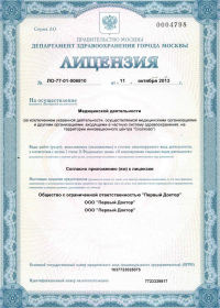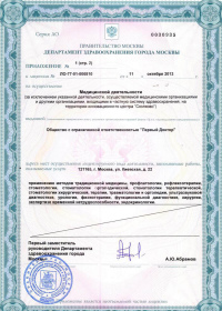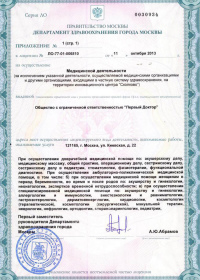 | Лицензии | 20.07.2017 Номер лицензии: ЛО-77-01-014575 Лицензируемый вид деятельности: Медицинская деятельность Дата внесения записи в реестр: 20.07.2017 Номер приказа о предоставлении лицензии: 05-05-425-Л Дата приказа о предоставлении лицензии: 20.07.2017 Адрес мест осуществления лицензируемого вида деятельности: 127566, г. Москва, бульвар Северный, д. 7 Б 11.10.2013 Номер лицензии: ЛО-77-01-006810 Лицензируемый вид деятельности: Медицинская деятельность Дата внесения записи в реестр: 11.10.2013 Номер приказа о предоставлении лицензии: 555-Л Дата приказа о предоставлении лицензии: 11.10.2013 Адрес мест осуществления лицензируемого вида деятельности: 121165, г. Москва, ул. Киевская, д. 22 |