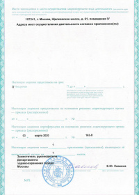 | Лицензии | 03.03.2020 Номер лицензии: ЛО-77-01-019713 Лицензируемый вид деятельности: Медицинская деятельность Дата внесения записи в реестр: 03.03.2020 Номер приказа о предоставлении лицензии: 163-Л Дата приказа о предоставлении лицензии: 03.03.2020 Адрес мест осуществления лицензируемого вида деятельности: 107241, г. Москва, Щелковское шоссе, д. 61 27.01.2016 Номер лицензии: ЛО-77-01-011698 Лицензируемый вид деятельности: Медицинская деятельность Дата внесения записи в реестр: 27.01.2016 Номер приказа о предоставлении лицензии: 47-Л Дата приказа о предоставлении лицензии: 27.01.2016 Адрес мест осуществления лицензируемого вида деятельности: 107241, г. Москва, Щелковское шоссе, д. 61 |