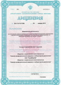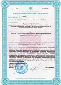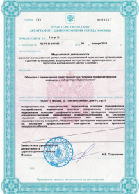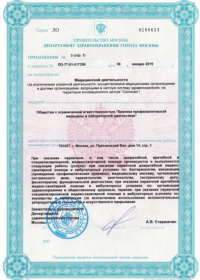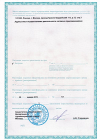 | Лицензии | 12.04.2019 Номер лицензии: ЛО-77-01-017869 Лицензируемый вид деятельности: Медицинская деятельность Дата внесения записи в реестр: 12.04.2019 Номер приказа о предоставлении лицензии: 280-Л Дата приказа о предоставлении лицензии: 12.04.2019 Адрес мест осуществления лицензируемого вида деятельности: 123100, г. Москва, р-н Пресненский, пр. 1-й Красногвардейский, д. 12, стр. 3 |