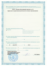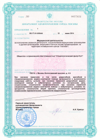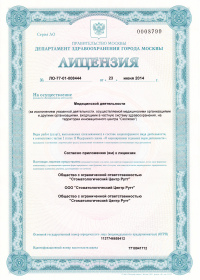 | Лицензии | 23.06.2014 Номер лицензии: ЛО-77-01-008444 Лицензируемый вид деятельности: Медицинская деятельность Дата внесения записи в реестр: 23.06.2014 Номер приказа о предоставлении лицензии: 412-Л Дата приказа о предоставлении лицензии: 23.06.2014 Адрес мест осуществления лицензируемого вида деятельности: 109316, г. Москва, Волгоградский проспект, д. 4 А |