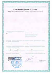 | Лицензии | 10.01.2020 Номер лицензии: ЛО-77-01-019415 Лицензируемый вид деятельности: Медицинская деятельность Дата внесения записи в реестр: 10.01.2020 Номер приказа о предоставлении лицензии: 7-Л Дата приказа о предоставлении лицензии: 10.01.2020 Адрес мест осуществления лицензируемого вида деятельности: 111024, г. Москва, ул. Кабельная 2-я, д. 2, стр. 25 25.02.2019 Номер лицензии: ЛО-77-01-017576 Лицензируемый вид деятельности: Медицинская деятельность Дата внесения записи в реестр: 25.02.2019 Номер приказа о предоставлении лицензии: 142-Л Дата приказа о предоставлении лицензии: 25.02.2019 Адрес мест осуществления лицензируемого вида деятельности: 111024, г. Москва, ул. Кабельная 2-я, д. 2, стр. 26 13.02.2015 Номер лицензии: ЛО-77-03-000353 Лицензируемый вид деятельности: Деятельность по обороту наркотических средств, психотропных веществ и их прекурсоров, культивированию наркосодержащих растений Дата внесения записи в реестр: 13.02.2015 Номер приказа о предоставлении лицензии: 70-Л Дата приказа о предоставлении лицензии: 13.02.2015 Адрес мест осуществления лицензируемого вида деятельности: 111024, г. Москва, ул. 2-я Кабельная, д.2, стр. 37 11.09.2009 Номер лицензии: ЛО-77-01-001735 Лицензируемый вид деятельности: Медицинская деятельность Дата внесения записи в реестр: 11.09.2009 Номер приказа о предоставлении лицензии: 1116 Дата приказа о предоставлении лицензии: 11.09.2009 Адрес мест осуществления лицензируемого вида деятельности: 111024, г. Москва, ул. Кабельная 2-я, д. 2, стр. 4 |