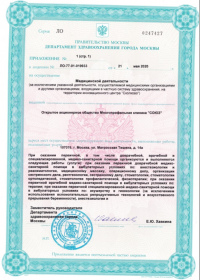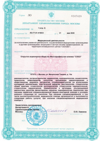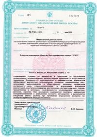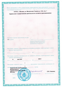 | Лицензии | 24.12.2019 Номер лицензии: ЛО-77-01-019348 Лицензируемый вид деятельности: Медицинская деятельность Дата внесения записи в реестр: 24.12.2019 Номер приказа о предоставлении лицензии: 1074-Л Дата приказа о предоставлении лицензии: 24.12.2019 Адрес мест осуществления лицензируемого вида деятельности: 107076, г. Москва, ул. Матросская Тишина, д. 14а 17.09.2019 Номер лицензии: ЛО-77-01-018764 Лицензируемый вид деятельности: Медицинская деятельность Дата внесения записи в реестр: 17.09.2019 Номер приказа о предоставлении лицензии: 761-Л Дата приказа о предоставлении лицензии: 17.09.2019 Адрес мест осуществления лицензируемого вида деятельности: 107076, г. Москва, ул. Матросская Тишина, д. 14а 04.06.2018 Номер лицензии: ЛО-77-03-000785 Лицензируемый вид деятельности: Деятельность по обороту наркотических средств, психотропных веществ и их прекурсоров, культивированию наркосодержащих растений Дата внесения записи в реестр: 04.06.2018 Номер приказа о предоставлении лицензии: 410-Л Дата приказа о предоставлении лицензии: 04.06.2018 Адрес мест осуществления лицензируемого вида деятельности: 107076, г. Москва, ул. Матросская Тишина, д. 14а |