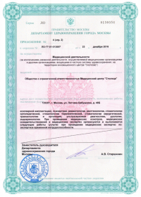 | Лицензии | 23.12.2016 Номер лицензии: ЛО-77-01-013697 Лицензируемый вид деятельности: Медицинская деятельность Дата внесения записи в реестр: 23.12.2016 Номер приказа о предоставлении лицензии: 769-Л Дата приказа о предоставлении лицензии: 23.12.2016 Адрес мест осуществления лицензируемого вида деятельности: 119002, г. Москва, пер. Б.Власьевский, д. 9 15.06.2016 Номер лицензии: ЛО-77-03-000578 Лицензируемый вид деятельности: Деятельность по обороту наркотических средств, психотропных веществ и их прекурсоров, культивированию наркосодержащих растений Дата внесения записи в реестр: 15.06.2016 Номер приказа о предоставлении лицензии: 371-Л Дата приказа о предоставлении лицензии: 15.06.2016 Адрес мест осуществления лицензируемого вида деятельности: 119002, г. Москва, пер. Большой Власьевский, д.9 08.02.2011 Номер лицензии: ЛО-77-01-003444 Лицензируемый вид деятельности: Медицинская деятельность Дата внесения записи в реестр: 08.02.2011 Номер приказа о предоставлении лицензии: 104 Дата приказа о предоставлении лицензии: 08.02.2011 Адрес мест осуществления лицензируемого вида деятельности: 119313, г. Москва, Ленинский проспект, д. 90 09.08.2010 Номер лицензии: ЛО-77-01-002870 Лицензируемый вид деятельности: Медицинская деятельность Дата внесения записи в реестр: 09.08.2010 Номер приказа о предоставлении лицензии: 1240 Дата приказа о предоставлении лицензии: 09.08.2010 Адрес мест осуществления лицензируемого вида деятельности: 119313, г. Москва, Ленинский проспект, д. 90 28.06.2010 Номер лицензии: ЛО-77-01-002691 Лицензируемый вид деятельности: Медицинская деятельность Дата внесения записи в реестр: 28.06.2010 Номер приказа о предоставлении лицензии: 1019 Дата приказа о предоставлении лицензии: 28.06.2010 Адрес мест осуществления лицензируемого вида деятельности: 119313, г. Москва, Ленинский проспект, д. 90 |