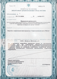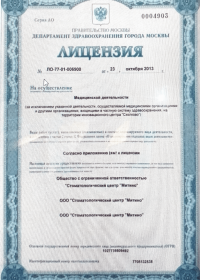 | Лицензии | 23.10.2013 Номер лицензии: ЛО-77-01-006900 Лицензируемый вид деятельности: Медицинская деятельность Дата внесения записи в реестр: 23.10.2013 Номер приказа о предоставлении лицензии: 583-Л Дата приказа о предоставлении лицензии: 23.10.2013 Адрес мест осуществления лицензируемого вида деятельности: 125368, г. Москва, ул. Митинская, д. 43 |