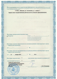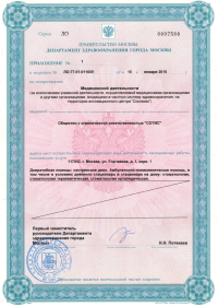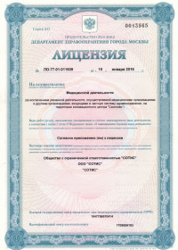| Лицензии | 15.11.2019 Номер лицензии: ЛО-77-01-019096 Лицензируемый вид деятельности: Медицинская деятельность Дата внесения записи в реестр: 15.11.2019 Номер приказа о предоставлении лицензии: 948-Л Дата приказа о предоставлении лицензии: 15.11.2019 Адрес мест осуществления лицензируемого вида деятельности: 117042, г. Москва, ул. Горчакова, д. 1, корп. 1 15.01.2016 Номер лицензии: ЛО-77-01-011609 Лицензируемый вид деятельности: Медицинская деятельность Дата внесения записи в реестр: 15.01.2016 Номер приказа о предоставлении лицензии: 18-Л Дата приказа о предоставлении лицензии: 15.01.2016 Адрес мест осуществления лицензируемого вида деятельности: 117042, г. Москва, ул. Горчакова, д. 1, корп. 1 |