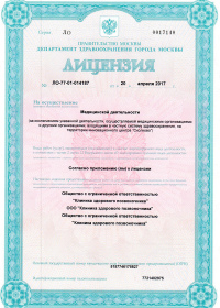| Лицензии | 20.06.2018 Номер лицензии: ЛО-77-01-016241 Лицензируемый вид деятельности: Медицинская деятельность Дата внесения записи в реестр: 20.06.2018 Номер приказа о предоставлении лицензии: 451-Л Дата приказа о предоставлении лицензии: 20.06.2018 Адрес мест осуществления лицензируемого вида деятельности: 127282, г. Москва, ул. Широкая, д. 3, корп. 3 |