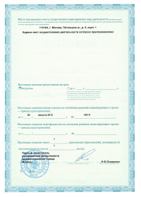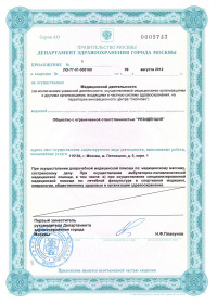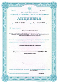 | Лицензии | 19.09.2014 Номер лицензии: ЛО-77-01-009027 Лицензируемый вид деятельности: Медицинская деятельность Дата внесения записи в реестр: 19.09.2014 Номер приказа о предоставлении лицензии: 646-Л Дата приказа о предоставлении лицензии: 19.09.2014 Адрес мест осуществления лицензируемого вида деятельности: 115184, г. Москва, ш. Пятницкое, д. 6, корп. 1 |