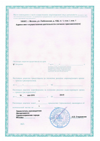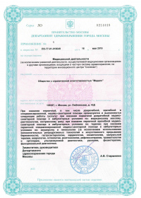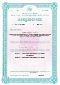 | Лицензии | 16.05.2019 Номер лицензии: ЛО-77-01-018049 Лицензируемый вид деятельности: Медицинская деятельность Дата внесения записи в реестр: 16.05.2019 Номер приказа о предоставлении лицензии: 354-Л Дата приказа о предоставлении лицензии: 16.05.2019 Адрес мест осуществления лицензируемого вида деятельности: 109387, г. Москва, ул. Люблинская, д. 42Д |
